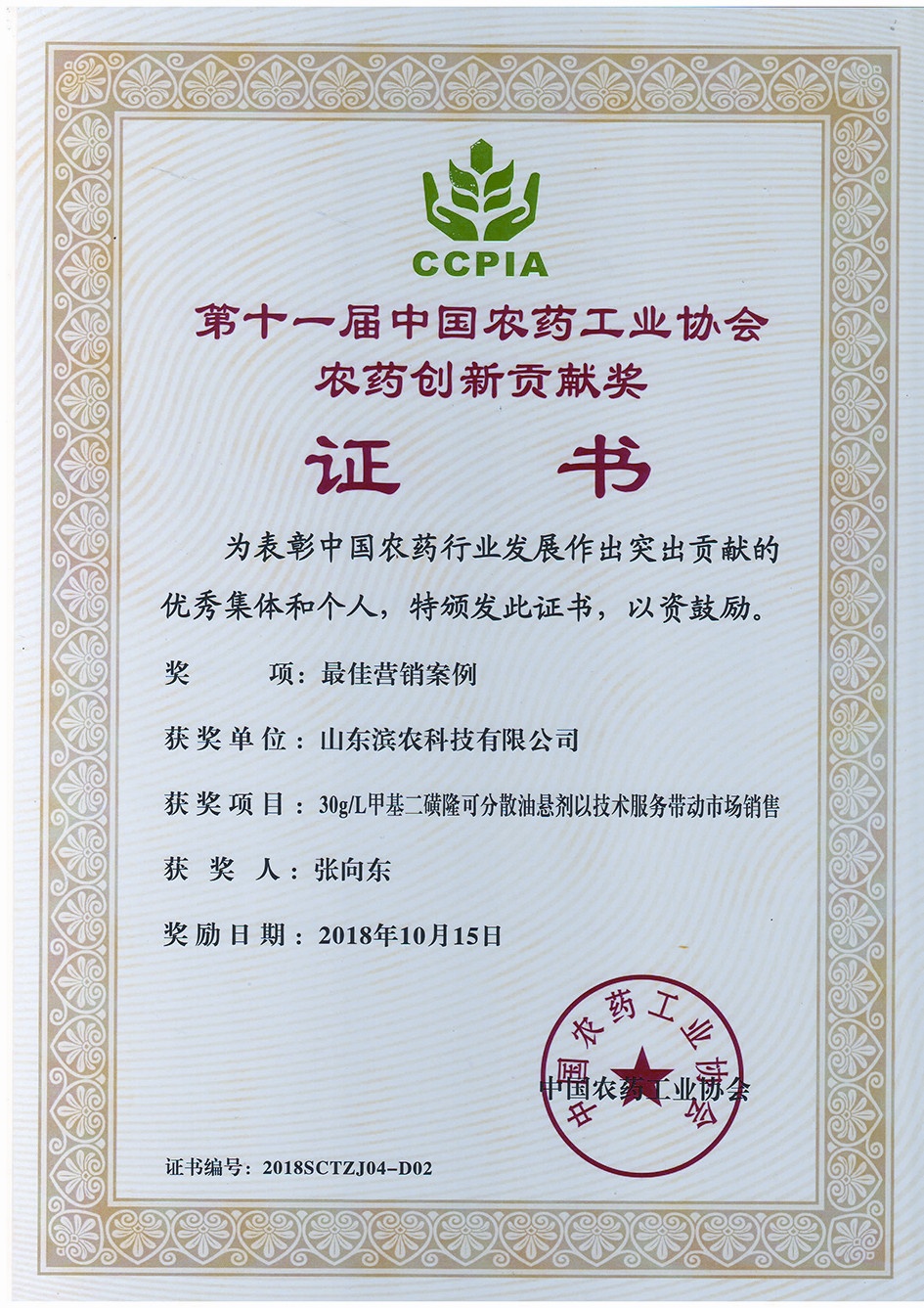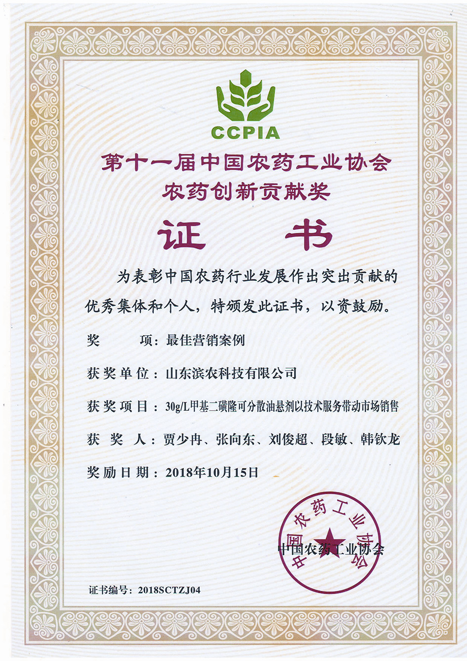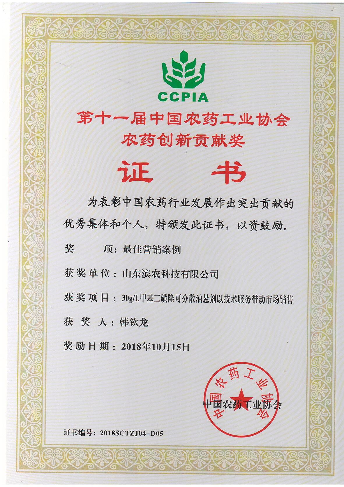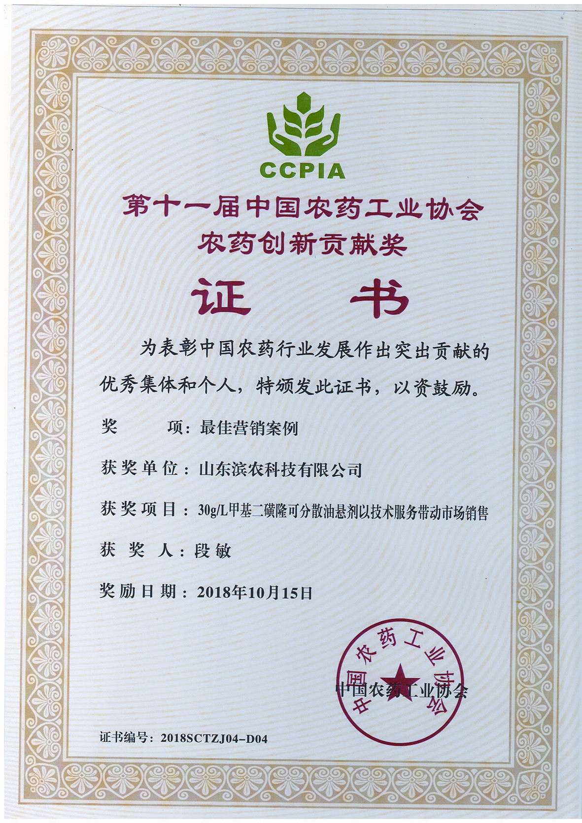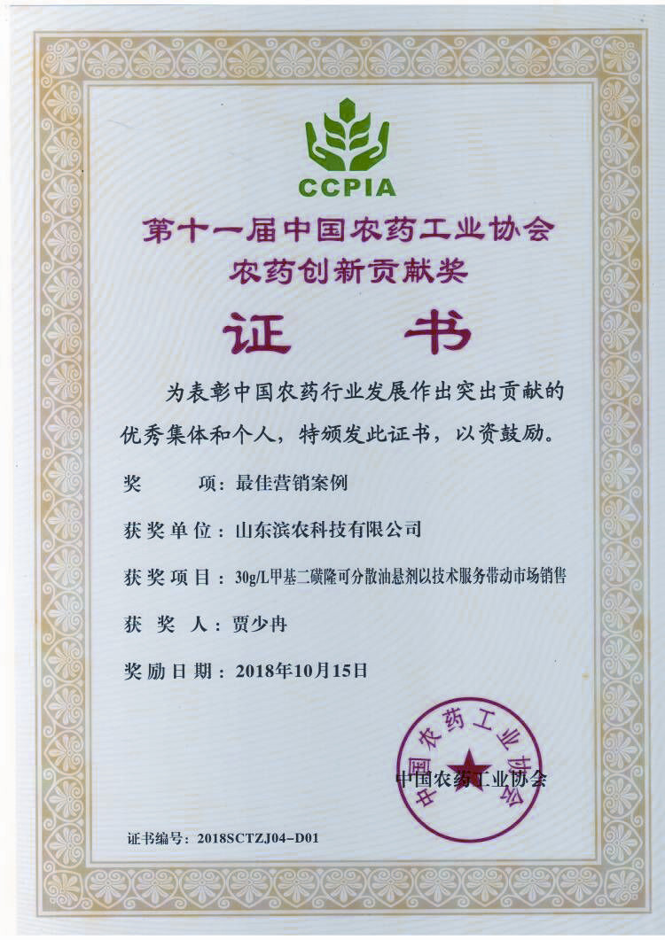 ■2018-10-15 我公司“30g/L甲基二磺隆可分散油懸劑以技術服務帶動市場銷售”榮獲“中國農