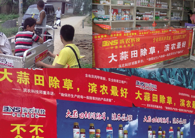 9月,推廣部的生力軍又開進了大蒜之鄉(xiāng)——金鄉(xiāng),開始了新一年的大蒜田除草劑的推廣。炎炎烈日下,我們走街串巷打廣告貼宣傳,重點街道、搶眼位置,到處留下了我們的宣傳標(biāo)語。一滴滴汗水流下,我們沒有一聲抱怨。